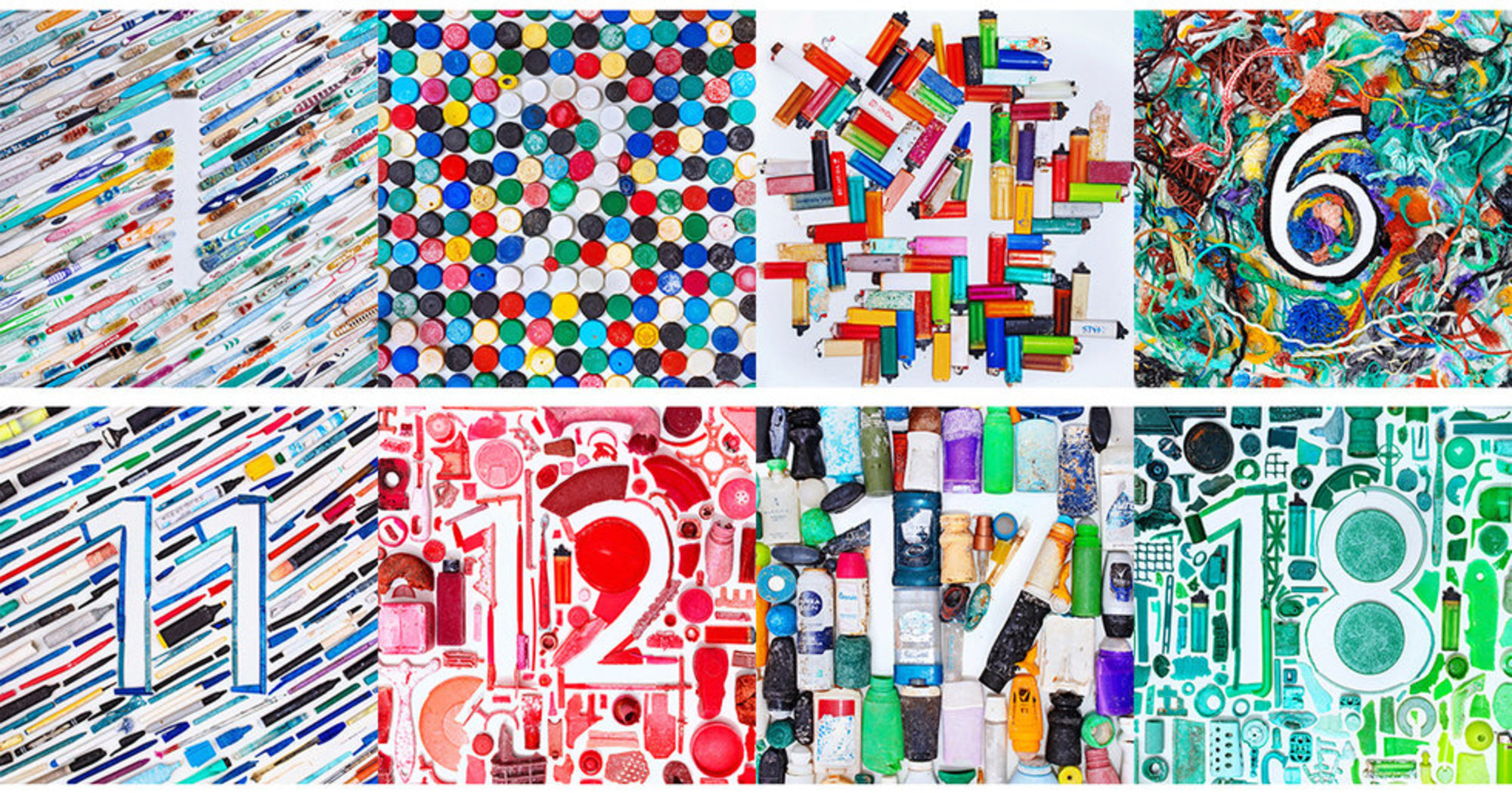 Svaka fotografija prikazuje vješto raspoređene plastične predmete koje je Andrews pronašla na plažama.